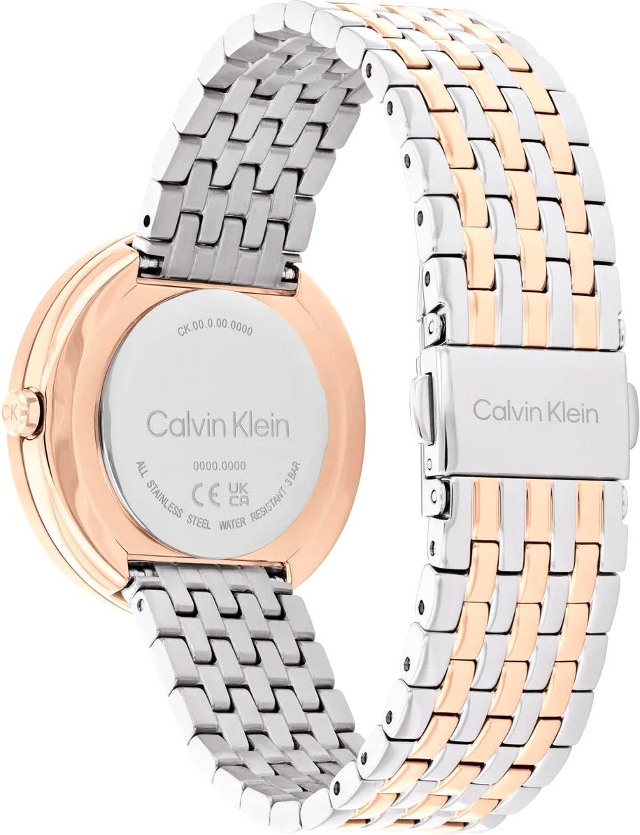Циферблат без меток выполнен по технологии Sunray (солнечные лучи) и украшен фирменным логотипом Calvin Klein. Прямоугольные стрелки в стиле Baton. Секундная стрелка отсутствует.