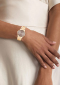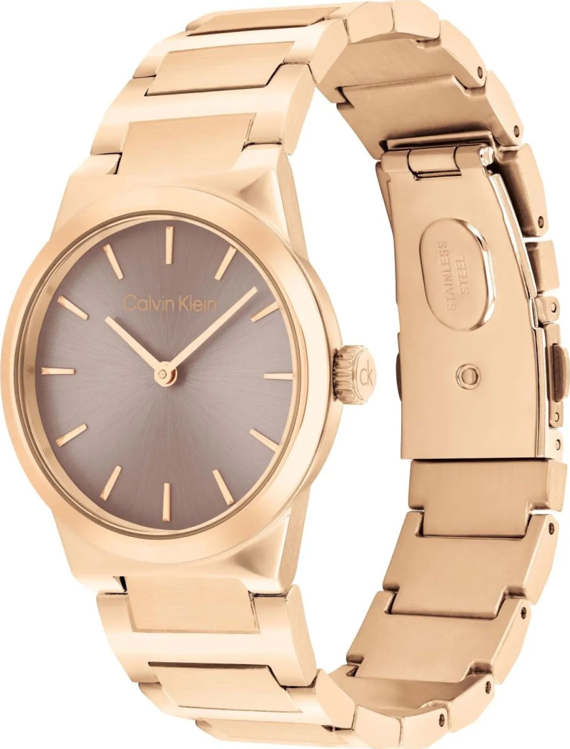 Надежный стальной браслет с IP покрытием цвета розового золота с чередующимися звеньями в матовой и полированной отделке. Раскладывающаяся застежка с двумя кнопками и логотипом бренда Calvin Klein.