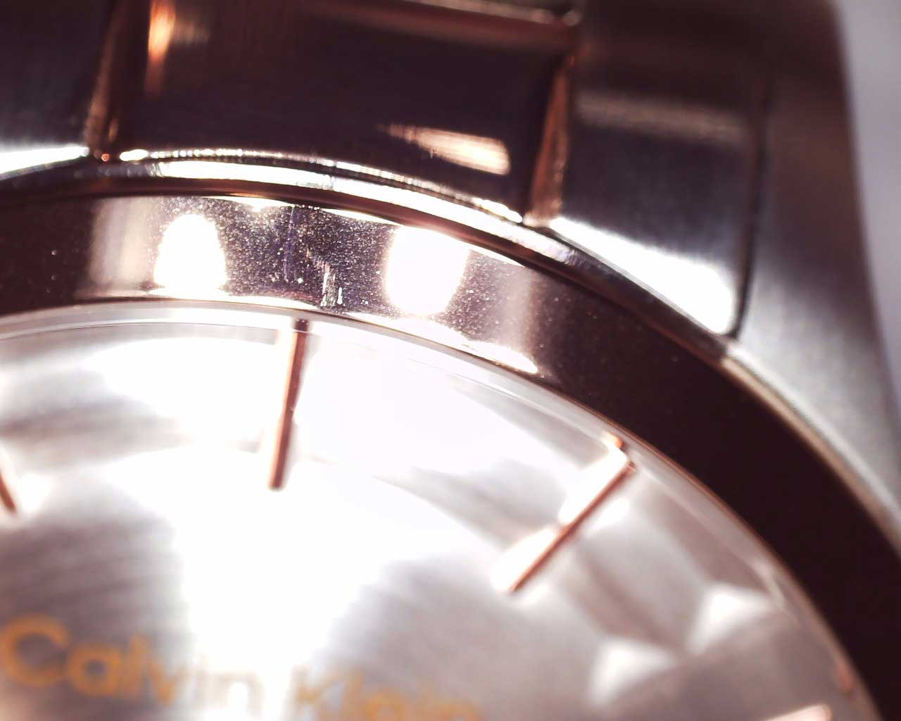 Циферблат выполнен по технологии Sunray (солнечные лучи) и украшен фирменным логотипом Calvin Klein. Накладные метки в виде штрихов. Прямоугольные стрелки в стиле Baton.