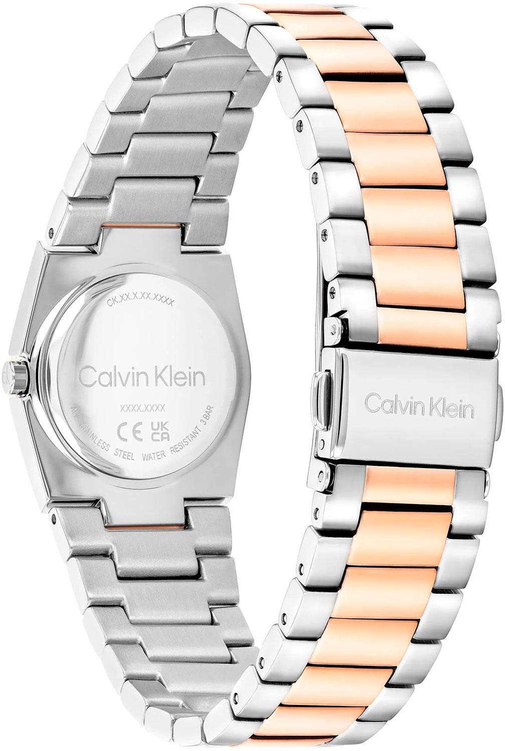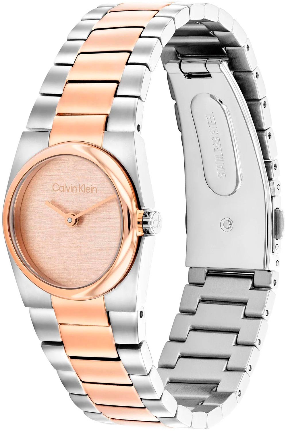Скругленные прямоугольные стрелки в стиле Baton. Секундная стрелка отсутствует. Рифленая заводная головка украшена логотипом ''ck''.