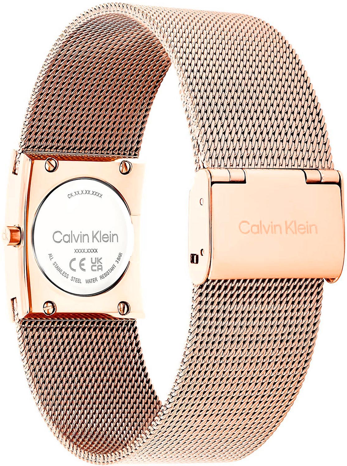 Гладкая заводная головка украшена логотипом ''CK''. Стальной браслет миланского плетения с регулируемой застежкой, украшенной логотипом бренда Calvin Klein.