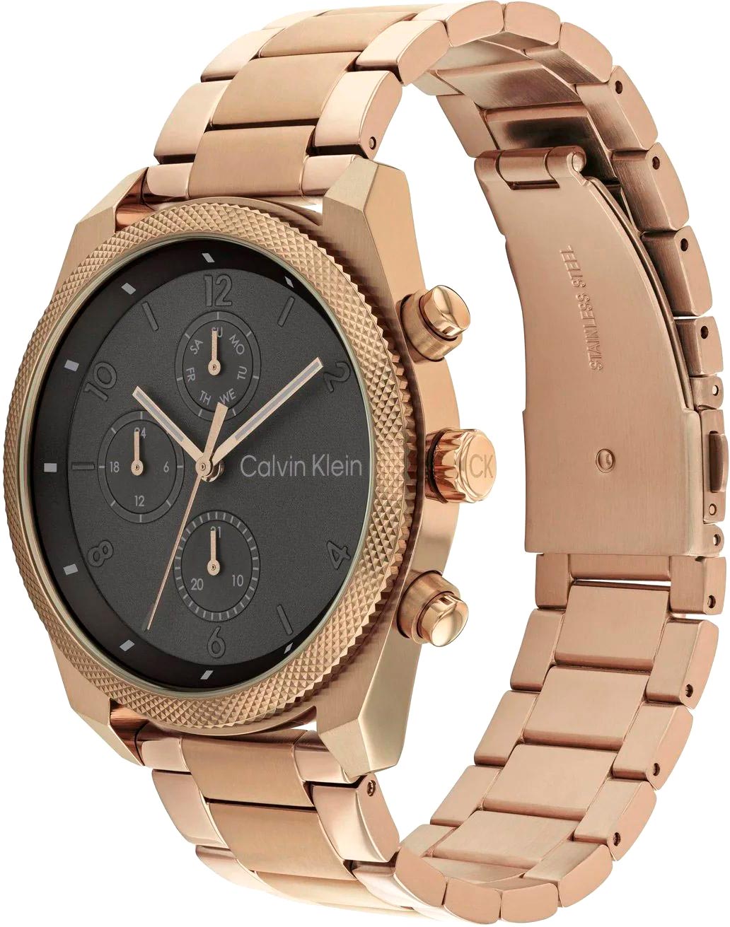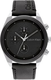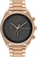 Зернистый матовый циферблат украшен фирменным логотипом Calvin Klein в положении 3 часа и защищен минеральным стеклом. Накладные метки в виде арабских цифр и штрихов.