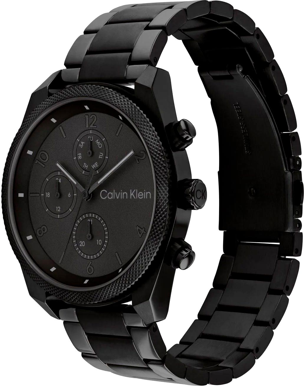 Надежный стальной браслет с матовой и полированной отделкой. Раскладывающаяся застежка с двумя кнопками и логотипом бренда Calvin Klein.