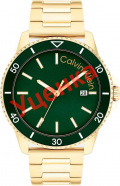 Мужские кварцевые часы. Корпус круглой формы из нержавеющей стали с IP покрытием. Рифленый безель с минутными отметками. Циферблат с метками в виде штрихов украшен фирменным логотипом Calvin Klein и защищен минеральным стеклом. Окошко даты находится в положении 3 часа. Рифленая заводная головка с защитой украшена логотипом ''CK''. Надежный стальной браслет H-Link с IP покрытием цвета желтого золота и раскладывающейся застежкой с двумя кнопками и логотипом бренда Calvin Klein.
