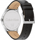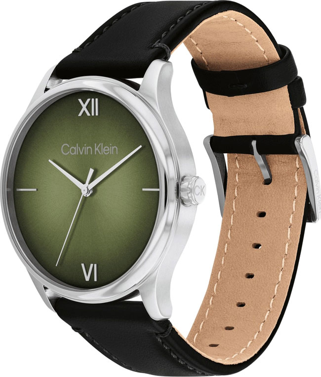Рифленая заводная головка. Черный кожаный ремешок с классической застежкой.