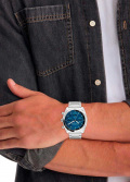Циферблат с радиальным узором, создающим эффект глубины выполнен по технологии Sunray (солнечные лучи) и украшен фирменным логотипом Calvin Klein.