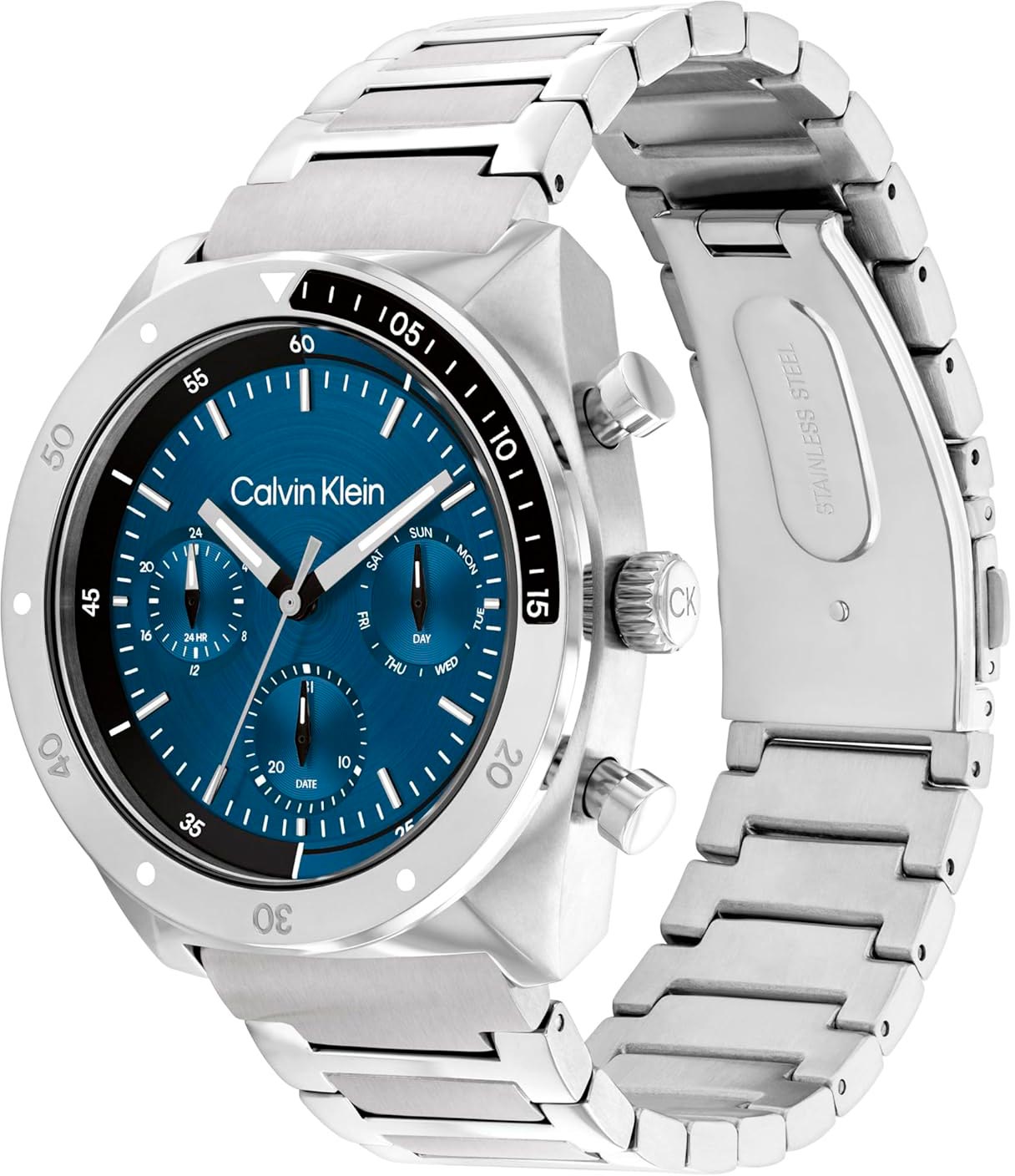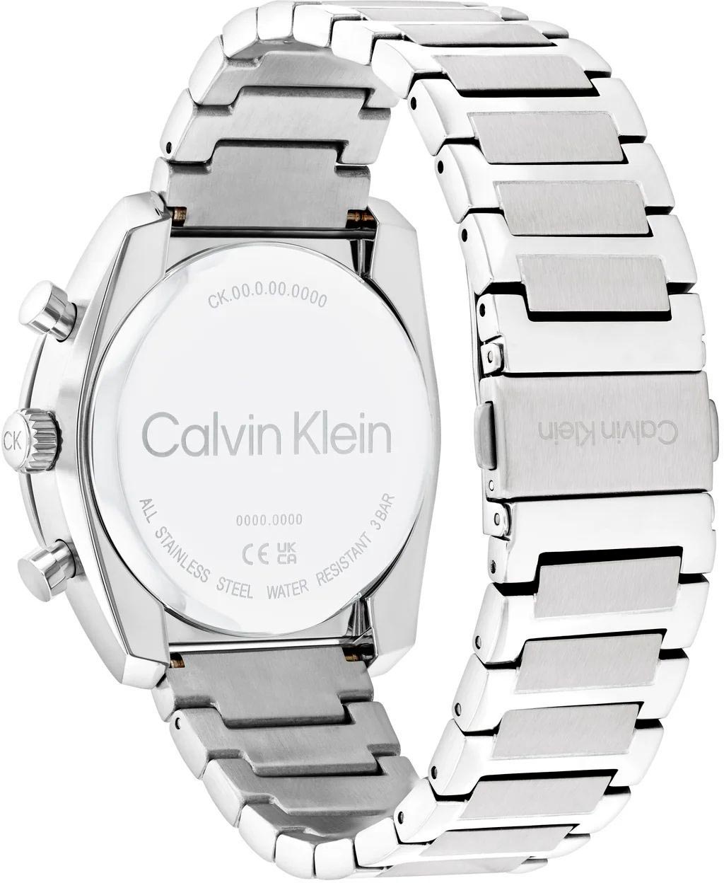 Циферблат с радиальным узором, создающим эффект глубины выполнен по технологии Sunray (солнечные лучи) и украшен фирменным логотипом Calvin Klein.