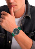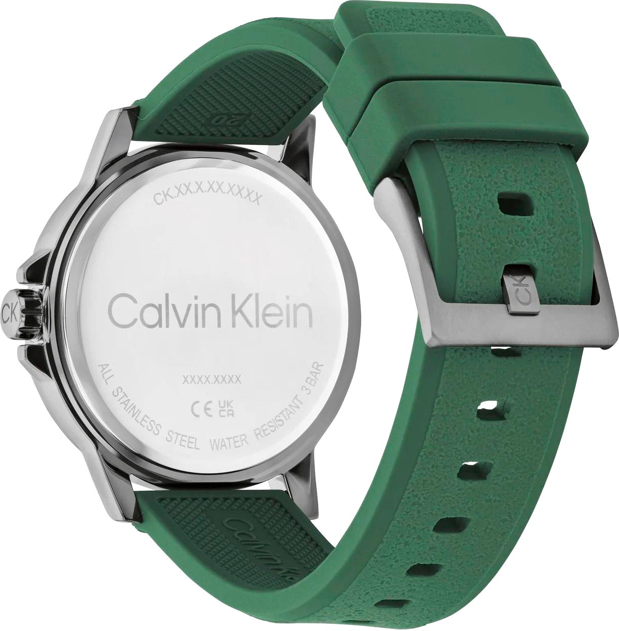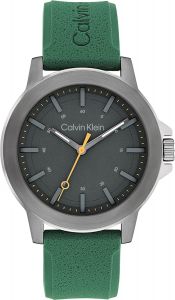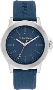 Рифленая заводная головка с защитой украшена логотипом ''CK''. Удобный силиконовый ремешок с текстурированной поверхностью. Классическая застежка с логотипом бренда Calvin Klein.