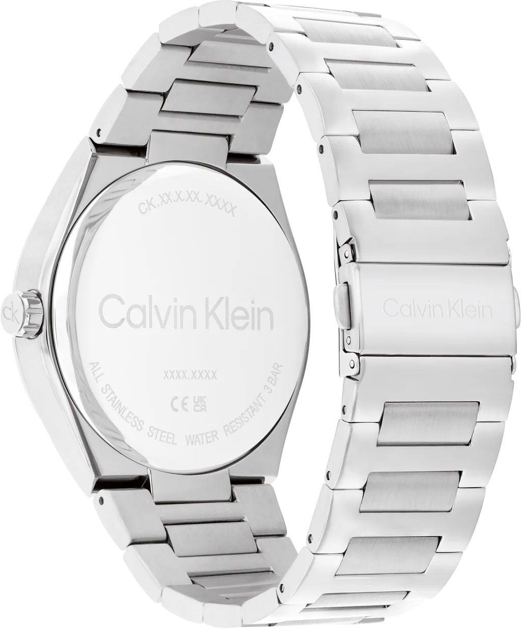 Надежный стальной браслет с матовой и полированной отделкой. Раскладывающаяся застежка с двумя кнопками и логотипом бренда Calvin Klein.