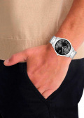 Циферблат выполнен по технологии Sunray (солнечные лучи) и украшен фирменным логотипом Calvin Klein. Накладные метки в виде штрихов. Прямоугольные стрелки в стиле Baton.