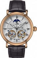Murg. Мужские механические часы. Круглый стальной корпус. В механизме 45 камней. Сквозь прозрачные окошки на циферблате можно наблюдать за работой механизма часов. День недели и фаза Луны вынесены на отдельный циферблат. Метки в виде римских цифр. Острые стрелки в стиле Alpha.