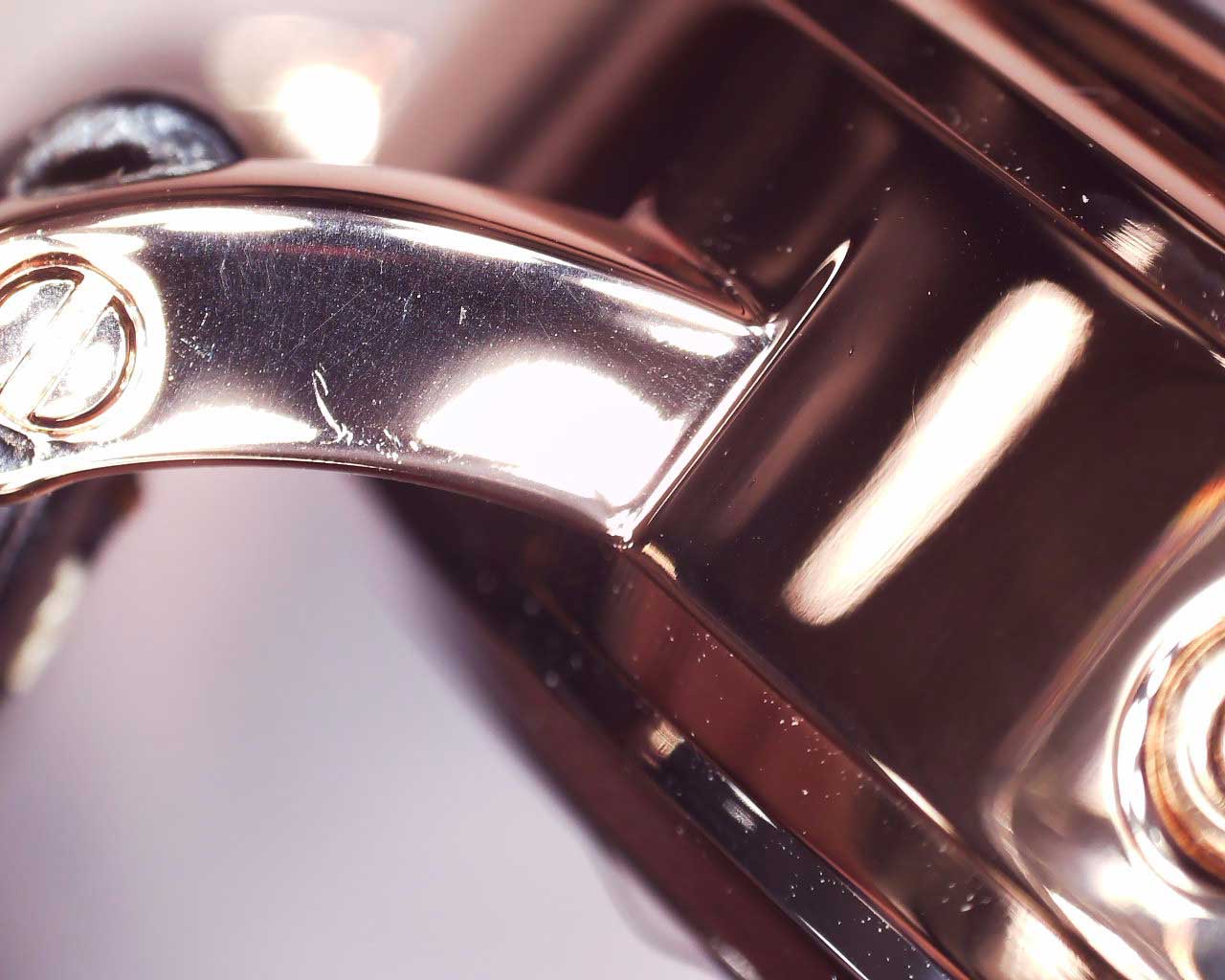 Рифленая заводная головка. Прозрачная задняя крышка из сапфирового стекла. Удобный кожаный ремешок из кожи теленка с классической стальной застежкой цвета розового золота.