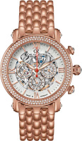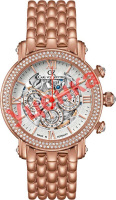 Kniebis. Скелетонизированные часы. Метки в виде штрихов и римских цифр. 12-ти и 24-х часовой формат времени. Число и день недели отображаются на отдельных циферблатах. В механизме 20 камней. Безель украшен паве из кристаллов. Рифленая заводная головка и функциональные кнопки украшены кристаллами в форме кабошона. Круглый корпус. Завинчивающаяся прозрачная задняя крышка. Браслет с раскладывающейся застежкой.