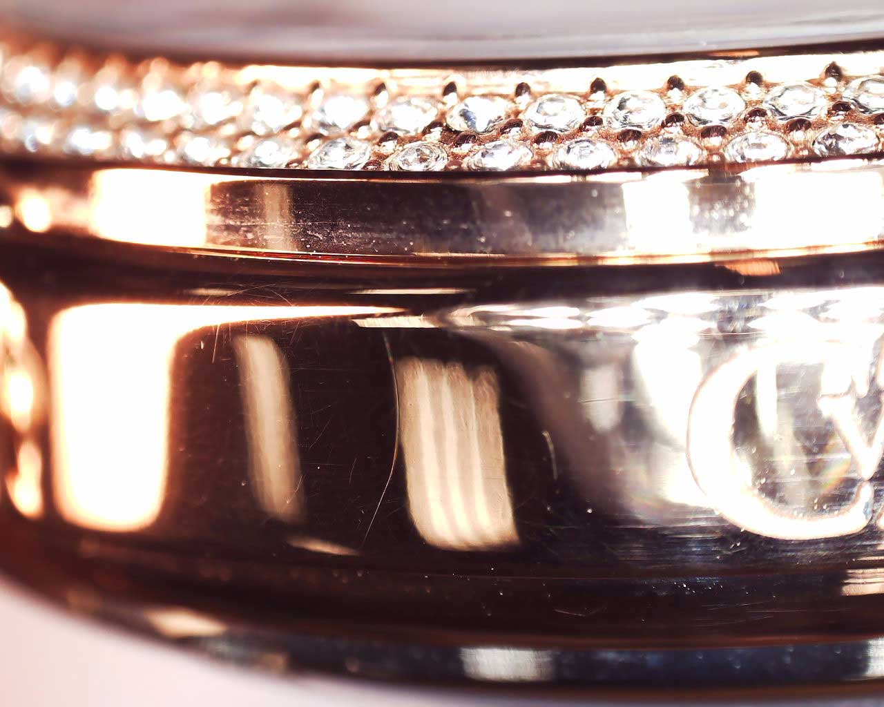 Kniebis. Скелетонизированные часы. Метки в виде штрихов и римских цифр. 12-ти и 24-х часовой формат времени. Число и день недели отображаются на отдельных циферблатах. В механизме 20 камней. Безель украшен паве из кристаллов. Рифленая заводная головка и функциональные кнопки украшены кристаллами в форме кабошона. Круглый корпус. Завинчивающаяся прозрачная задняя крышка. Браслет с раскладывающейся застежкой.