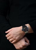 Острые стрелки в стиле Alpha. Граненая заводная головка с защитой. Задняя крышка из сапфирового стекла. Надежный стальной браслет с раскладывающейся застежкой.