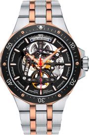 Urberg. Скелетизированные автоматические часы. В механизме 22 камня. Круглый стальной корпус. 12-ти гранный безель с минутной шкалой украшен декоративными винтами. Циферблат с метками в виде штрихов.