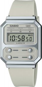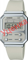 Vintage. Унисекс. Часы являются копией модели F-100, которая была первой моделью Casio в пластиковом корпусе. Отличительной чертой часов являются 4 кнопки на лицевой панели. Циферблат подсвечивается светодиодом. Цвет подсветки: оранжевый. Секундомер с точностью показаний 1/10с и временем измерения 1ч. Батарея рассчитана на 3 года. Водонепроницаемость в соответствии с DIN 8310/ISO 2281. Батарея рассчитана на 3 года. Ремешок с классической застежкой.