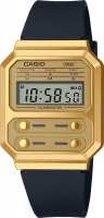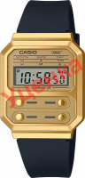 Vintage. Унисекс. Часы являются копией модели F-100, которая была первой моделью Casio в пластиковом корпусе. Отличительной чертой часов являются 4 кнопки на лицевой панели. Циферблат подсвечивается светодиодом. Цвет подсветки: оранжевый. Секундомер с точностью показаний 1/10с и временем измерения 1ч. Водонепроницаемость в соответствии с DIN 8310/ISO 2281. Батарея рассчитана на 3 года. Ремешок с классической застежкой.