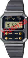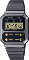 Vintage. Унисекс. Часы являются копией модели F-100, которая была первой моделью Casio в пластиковом корпусе. Отличительной чертой часов являются 4 кнопки на лицевой панели. Циферблат подсвечивается светодиодом. Цвет подсветки: красный. Секундомер с точностью показаний 1/10с и временем измерения 1ч. Водонепроницаемость в соответствии с DIN 8310/ISO 2281. Батарея рассчитана на 3 года. Браслет с регулируемой застежкой.