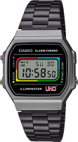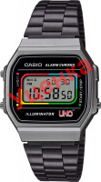 Casio Vintage x UNO. Унисекс часы. Модель посвящена популярной карточной игре UNO, которая была придумана в 1971 году парикмахером по имени Мерл Роббинс. В 1992 году права на игру выкупила компания Mattel, которая являлась на тот момент крупнейшим производителем игрушек. Электролюминесцентная подсветка обеспечивает равномерное освещение всего циферблата, облегчая считывание данных. В часах есть функция послесвечения - подсветка продолжает работать несколько секунд после того как кнопка подсветки была отпущена. Цвет подсветки: синий. Циферблат украшен цветами Wild-карты, которая предоставляет игроку выбор цвета. При активации подсветки на дисплее появляется слово «Wild». 12-ти и 24-х часовой формат времени. Секундомер с точностью показаний 1/100с и временем измерения 1ч. SPLIT-хронограф. Батарея рассчитана на 7 лет. Водонепроницаемость в соответствии с DIN 8310/ISO 2281. Стальная задняя крышка крепится на 4-х винтах и украшена надписью «UNO» и картами, которые образую номер модели часов 168. Браслет с регулируемой застежкой.