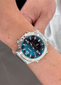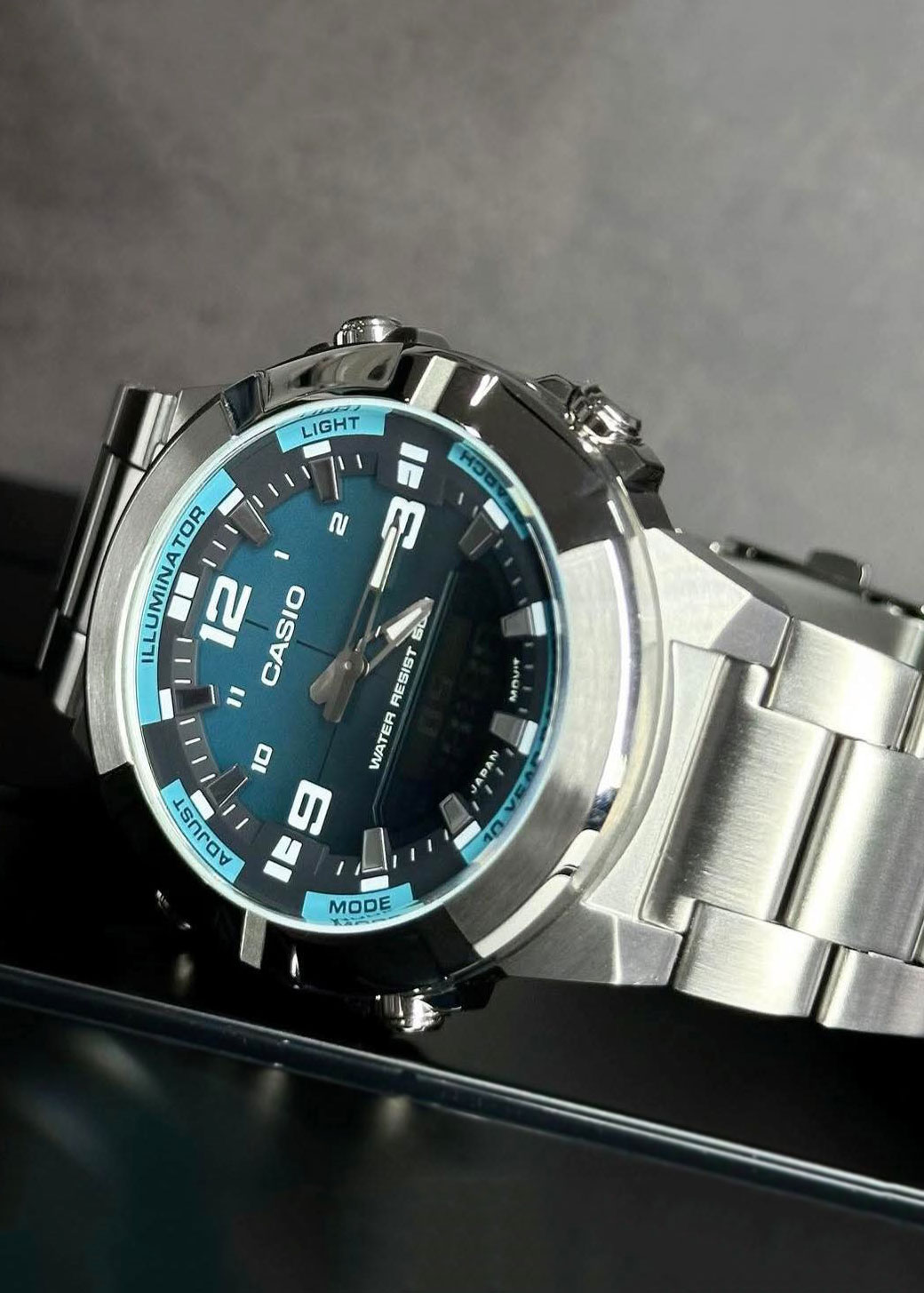 -: подсветка ( светодиоды на 3 и 9 часов) аналоговый циферблат менее читаемый а цифровой вообще не видно, что делает невозможным пользоваться всеми функциями в темноте. Светонакопительный люм светит не долго, спустя мин 20 его почти не видно.