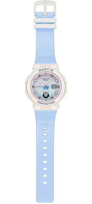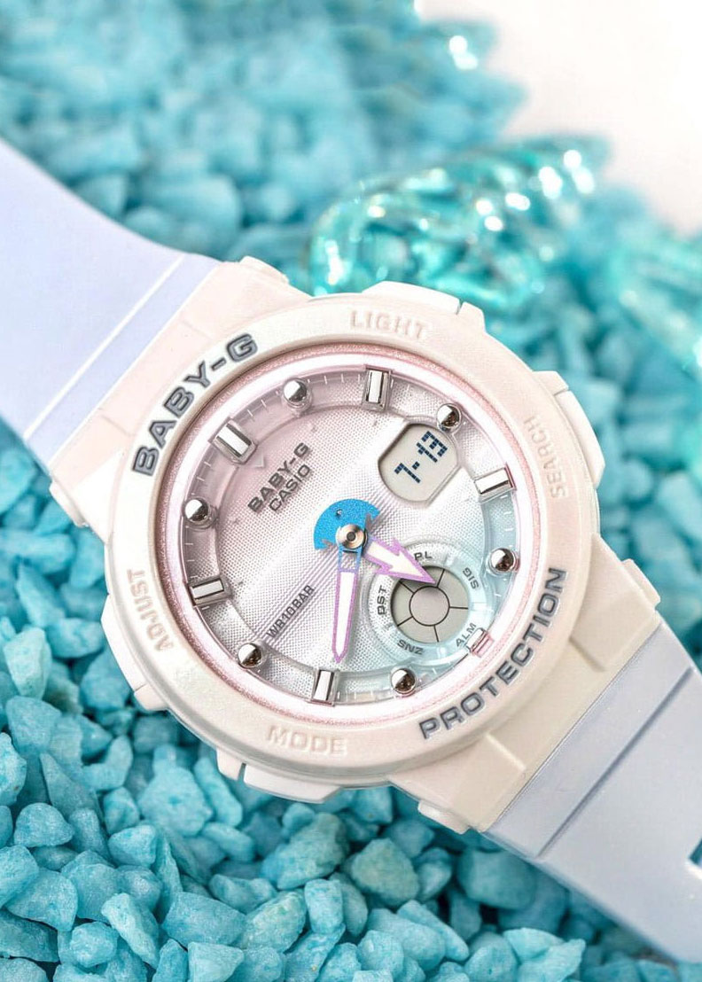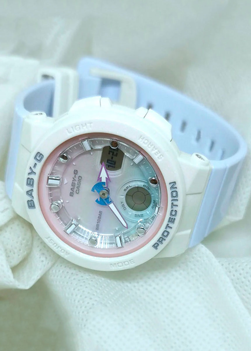 Прекрасный стильный аксессуар, который всегда дополнит и украсит любой ваш образ, а самое главное, будьте уверены, эти часы всегда будут хранить в себе частичку летнего тепла и настроения!Baby-G. Женские часы. Цветовая гамма вдохновлена градацией цвета морской ракушки. Полупрозрачный кант по краю циферблата напоминает искры океанской воды. Стрелки выполнены в виде руля и якоря лодки. Противоударный корпус