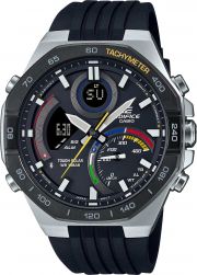 Edifice. Мужские часы. Циферблат с яркими элементами вдохновлен рулевым колесом гоночного автомобиля. Питание от солнечной энергии Tough Solar - высокоэффективная солнечная батарея, аккумулятор, индикатор низкого заряда батареи. Функция автоматического сохранения энергии. Время работы аккумулятора без подзарядки приблизительно 6 месяцев, при включенной функции сохранения энергии приблизительно 19 месяцев. Двойная подсветка Super Illuminator с функцией Afterglow (для подсветки не нужно удерживать кнопку, время послесвечения настраивается 1,5 или 3 сек): одновременно подсвечивается аналоговый циферблат и цифровой дисплей. Цвет подсветки: белый. Светонакопительное покрытие Neobrite обеспечивает длительное послесвечение в темноте даже после кратковременного нахождения на свету. 12-ти и 24-х часовой формат времени. Часы-хронограф с секундомером и тахиметром. Секундомер с разрешениями показаний: 1/1000 сек (до 1 ч) и 1/10 сек (после 1 ч) и временем измерения 24 ч. SPLIT-хронограф. Таймер обратного отсчета от 1 сек до 24 ч. Мировое время – 39 городов (39 часовых поясов). Автоматический переход на зимнее и летнее время, возможность включения/отключения данной функции. Беспроводная технология Bluetooth® со сверхнизким потреблением энергии для синхронизации со смартфоном. При подключении к смартфону часы автоматически корректируют текущее время, в том числе переход на зимнее/летнее время, копируют настройки мирового времени более чем для 300 городов. Приложение EDIFICE Connected позволяет вести журнал показаний секундомера и прохождения этапов, вычислять разность между заданным временем и временем этапа. Память на 200 этапов. Измерение скорости отображается на ретроградном циферблате в положении 4 часа. Функция перемещения стрелок для беспрепятственного просмотра информации на цифровых дисплеях, включения/отключения звука и поиска телефона. Циферблат выполнен по технологии Sunray (солнечные лучи). Заводная головка с защитой. Ремешок из полимерного материала с классической застежкой.