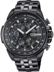 Edifice. Часы-хронограф с секундомером и тахиметром. Секундомер с точностью показаний 1с и временем измерения 5ч. Ретроградный указатель часов хронографа. Циферблат с метками в виде штрихов выполнен по технологии Sunray (солнечные лучи). Окошко даты и дня недели. Завинчивающаяся заводная головка. Задняя крышка с винтовым фиксатором. Батарея рассчитана на 5 лет. Браслет с раскладывающейся тройной застежкой, расстегиваемой одним касанием. Предохранительная защелка на браслете препятствует случайному расстегиванию.