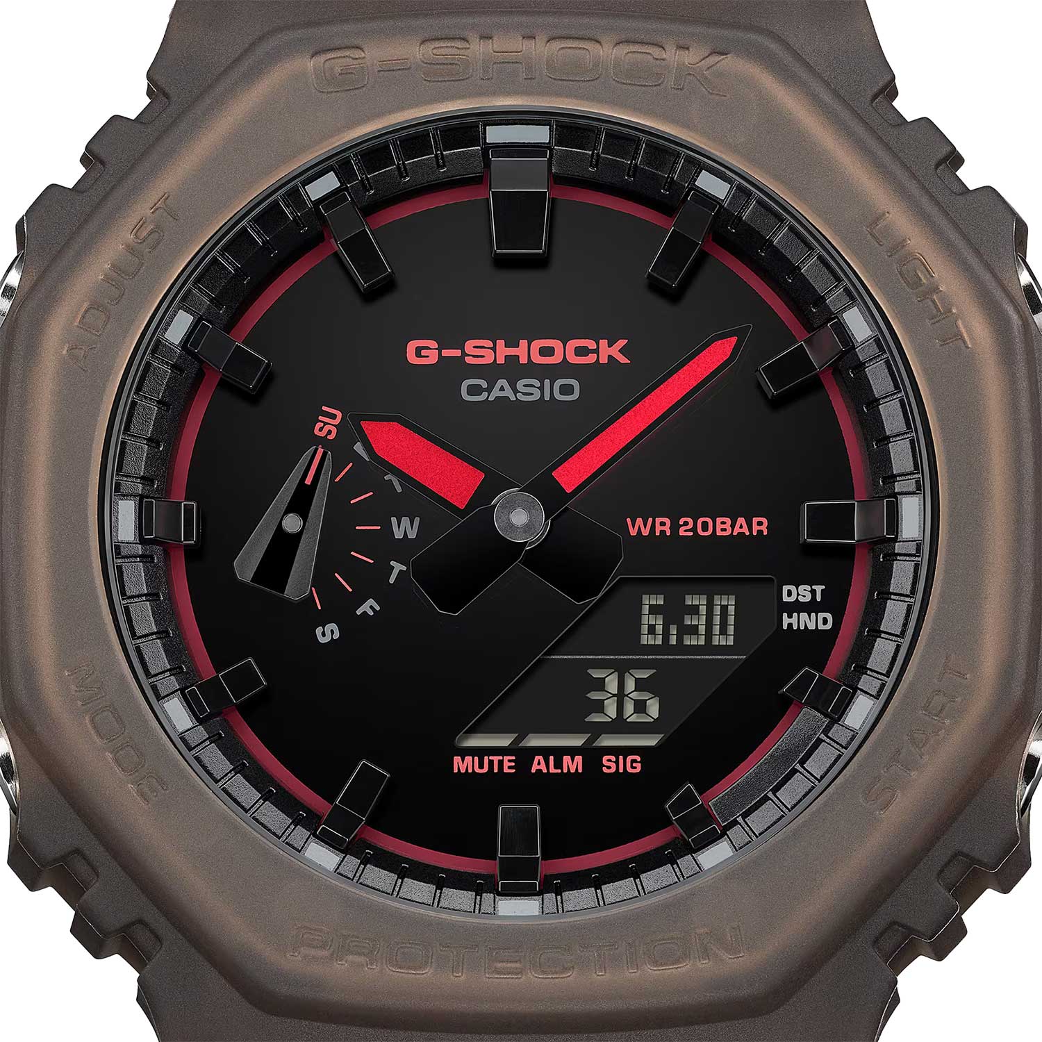 Корпус часов GA-2100 представляет собой эстетическое сочетание самой первой коллекции часов G-Shock (известной как DW-5000) 1983 года и более поздней коллекции аналогово-цифровых часов Casio G-Shock AW-500.