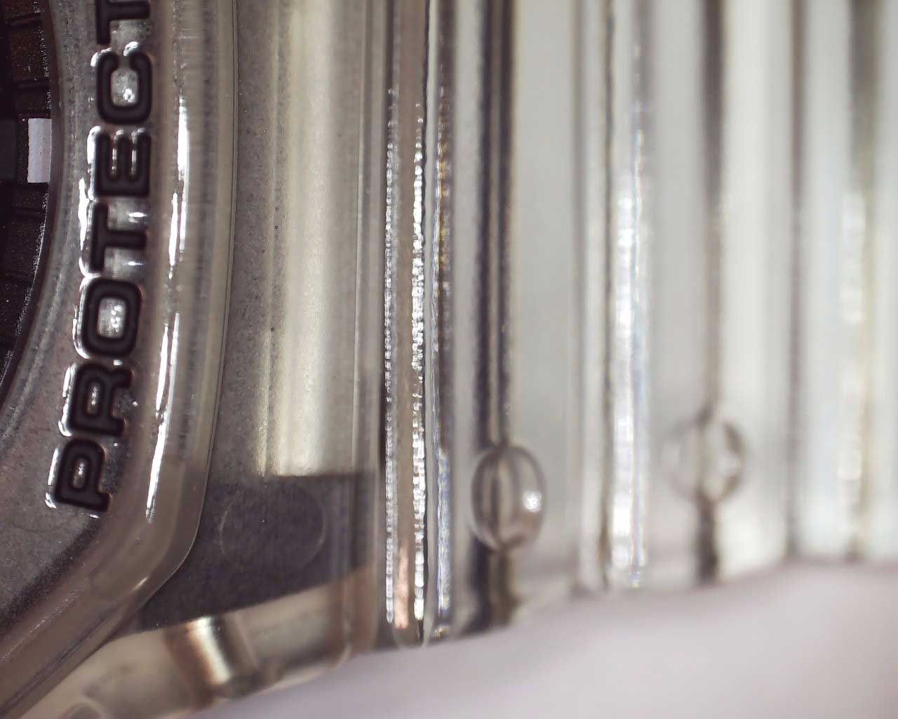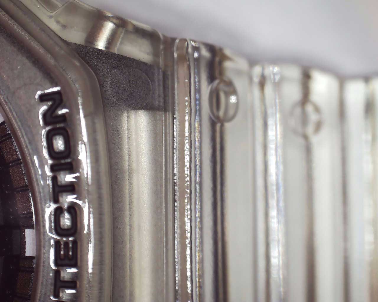 Прозрачные часы со структурой Carbon Core Guard. Противоударный пластиковый корпус с карбоновыми волокнами более прочный и, в то же время, более легкий. Этот же материал защищает внутренний модуль от повреждений и деформаций при ударах. Электролюминесцентная подсветка освещает весь циферблат. Функция парный иллюминатор обеспечивает подсветку не только аналогового циферблата, но и цифрового дисплея. Послесвечение. Цвет подсветки: белый. Необритовое светонакопительное покрытие обеспечивает длительное послесвечение в темноте даже после кратковременного нахождения на свету. 12-ти и 24-х часовой формат времени. Секундомер с двумя точностями показаний: 1/100с (до 1ч) и 1с (после 1ч) и временем измерения 24ч. SPLIT-хронограф. Таймер обратного отсчета от 1с до 24ч. Мировое время – 48 городов (31 часовой пояс), всемирное координированное время (UTC). Функция включения/отключения летнего времени. Ретроградный указатель для недели. Функции отключения/включения звука и перемещения стрелок для беспрепятственного просмотра информации на цифровых дисплеях. Батарейка рассчитана на 3 года. Водонепроницаемость в соответствии с ISO 2281. Ремешок из полимерного материала с классической застежкой.