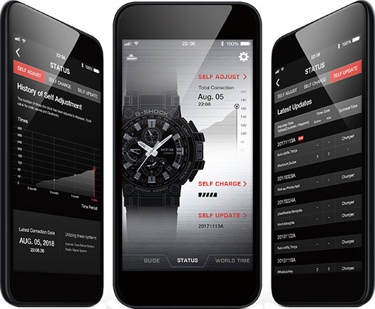 защищает механизм от ударов и вибрации. Тройная защита от воздействия гравитационной, центробежной и вибрационной сил. Модуль часового механизма покрыт виброустойчивым альфа-гелем. Питание от солнечной энергии Tough Solar - солнечные батарейки большой мощности, индикатор заряда батареи. Функция автоматического сохранения энергии. Время работы аккумулятора без подзарядки - 5 месяцев, при включенной функции сохранения энергии - 18 месяцев. Циферблат подсвечивается ярким светодиодом. Светонакопительное покрытие необрит продолжает светиться в темноте даже после непродолжительного пребывания на свету. Синхронизация со смартфоном по Bluetooth® через приложение SHOCK-Connected G. При подключении к смартфону часы корректируют текущее время (4-е раза в день), настройки мирового времени (до 300 городов), таймера и будильника. Автоматическая корректировка часового пояса и летнего времени. Функция поиска телефона. Индикатор уровня заряда батареи телефона. Технология Multi Band 6 позволяет принимать сигналы от шести радиовышек, расположенных в различных точках земного шара, которые передают временные сигналы от определенных атомных часов. Коррекция текущего времени радиосигналом на территории почти всей Европы, США, Японии и Китая. Функция автоматической коррекции положения стрелок проверяет положение стрелок каждый час и корректирует его в случае необходимости. Мировое время