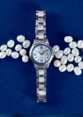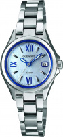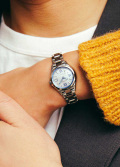 Перламутровый циферблат выполнен из белых жемчужных устриц. Метки в виде штрихов и римских цифр. Окошко даты находится в положении 3 часа. Заводная головка с защитой. Литой браслет с раскладывающейся застежкой. Имеется мужской вариант модели OCW-T150-2A.