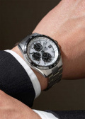• Циферблат с метками в виде штрихов защищен прочным сапфировым стеклом.