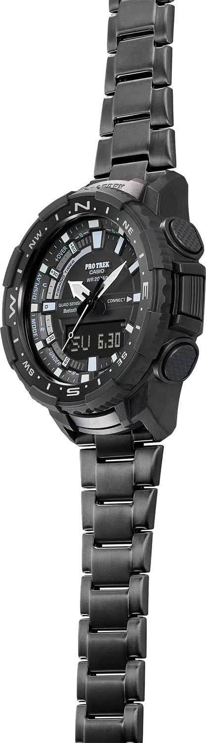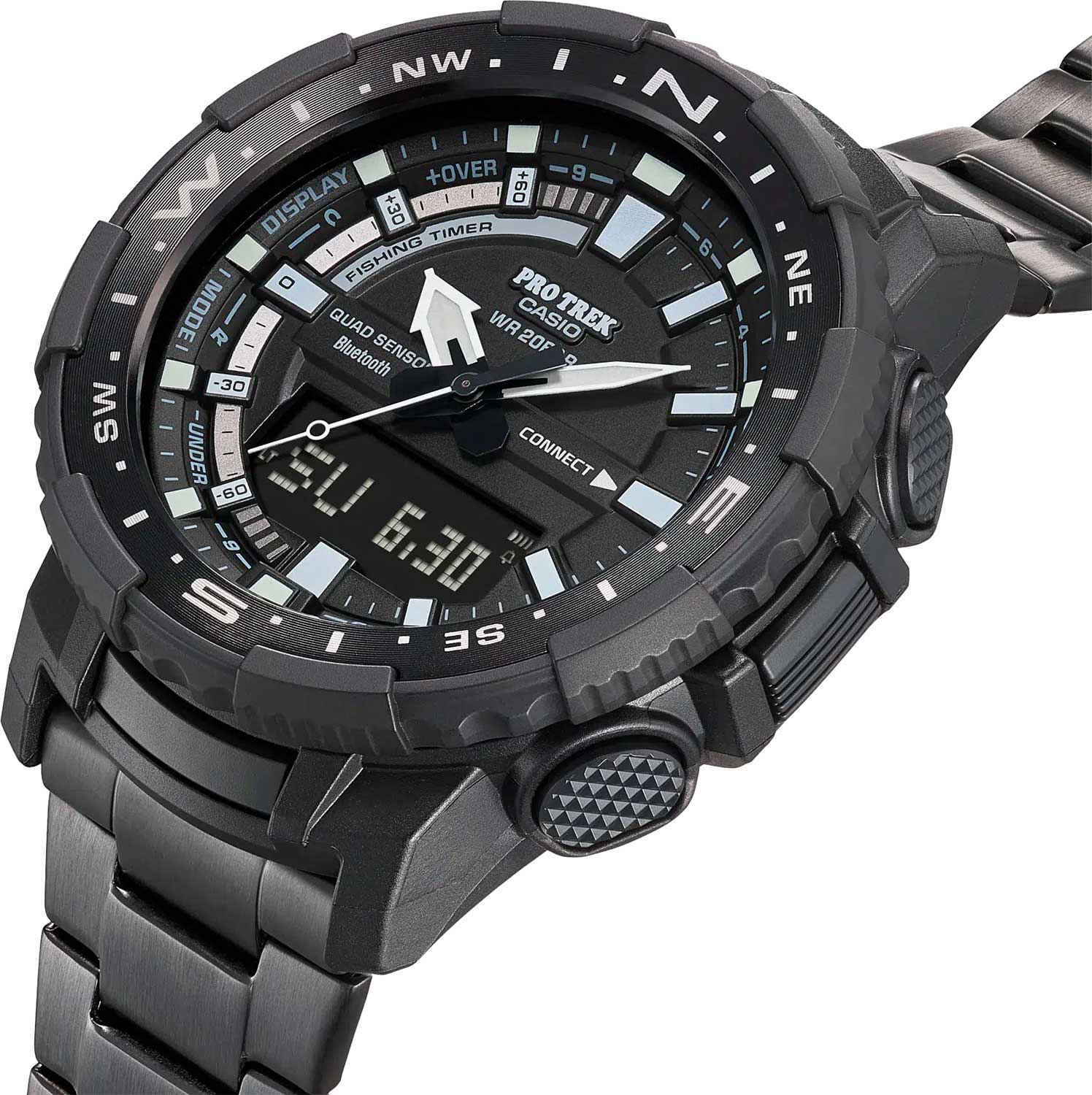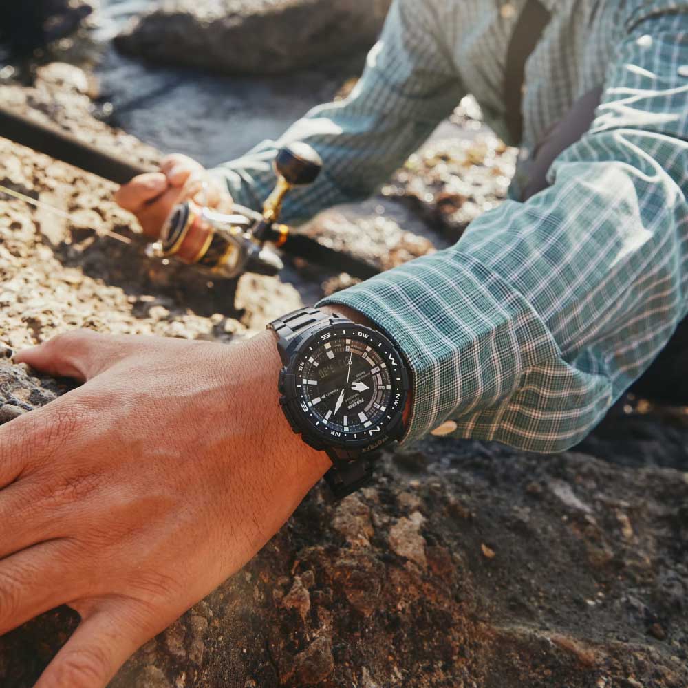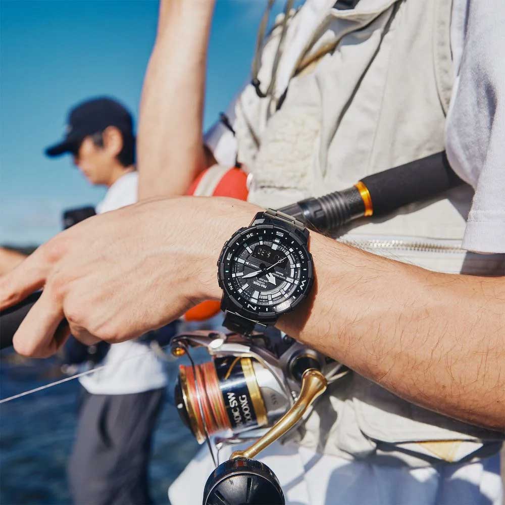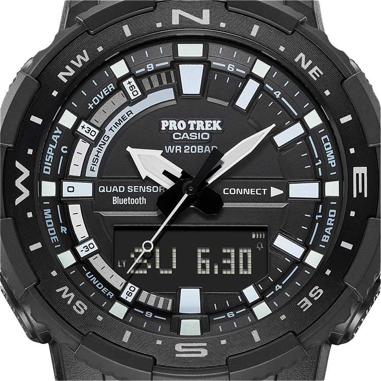 Заядлым рыбакам посвящается - абсолютно новые усовершенствованные часы, с которыми можно отправиться даже на Северный Полюс.Pro Trek. Мужские часы. Чтобы получить доступ ко всем функциям, специально разработанным для рыбалки, просто синхронизируйте ваши часы по Bluetooth со смартфоном, на котором запущено приложение PRO TREK Connected. Индикатор Fishing Timer- определяет время, наиболее подходящее для рыбалки. На экране отображаются символы в виде рыбы в том случае, если время идеально подходит для рыбалки. Двойная подсветка: одно нажатие кнопки обеспечит подсветку не только цифрового дисплея, но и аналогового циферблата. Благодаря наличию функции задержки, после отпускания кнопки освещение горит еще несколько секунд. Настраиваемое послесвечение 1,5 или 3сек. Цвет подсветки: белый. Модуль часов рассчитан на работу при низких температурах до -10°С/14°F. 12-ти и 24-х часовой формат
