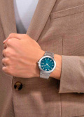 Прямоугольные стрелки в стиле Baton. Метки и стрелки с люминесцентным покрытием, которое светится в темноте после непродолжительной зарядки на свету. Окошко даты находится в положении 3 часа. Заводная головка в виде болта. Надежный стальной браслет с вертикальной матовой и полированной отделкой. Раскладывающаяся застежка.