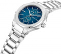 Дата и день недели вынесены на отдельные циферблаты. Рифленая заводная головка с защитой. Надежный стальной браслет с матовой и полированной отделкой. Раскладывающаяся застежка.