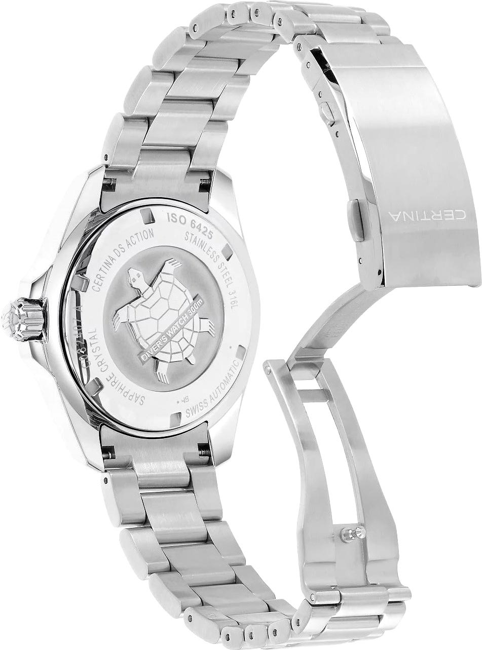Завинчивающаяся задняя крышка украшена рельефным символом бренда — панцирем черепахи, символизирующим надежность и долговечность. Надежный стальной браслет с раскладывающейся застежкой.