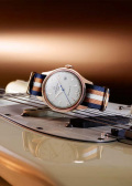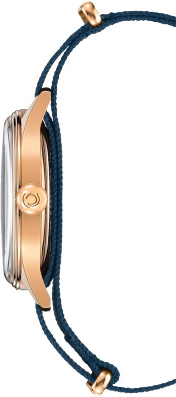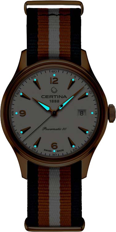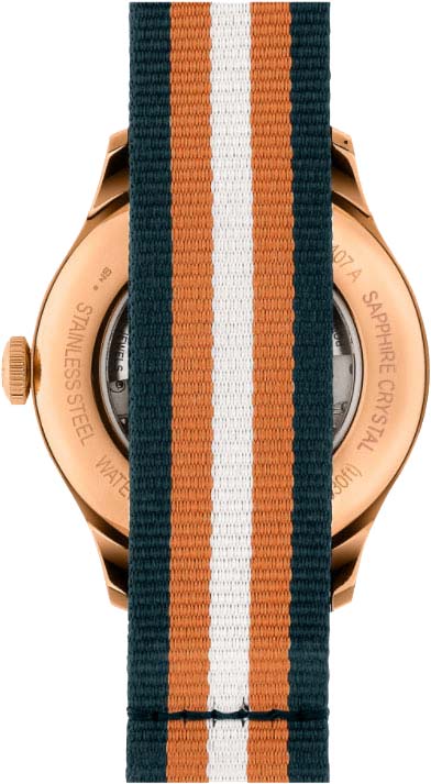 Метки и стрелки с люминесцентным покрытием, которое светится в темноте после непродолжительной зарядки на свету. Окошко даты находится в положении 3 часа. Прозрачная задняя крышка. Рифленая заводная головка. Нейлоновый ремешок с классической застежкой.