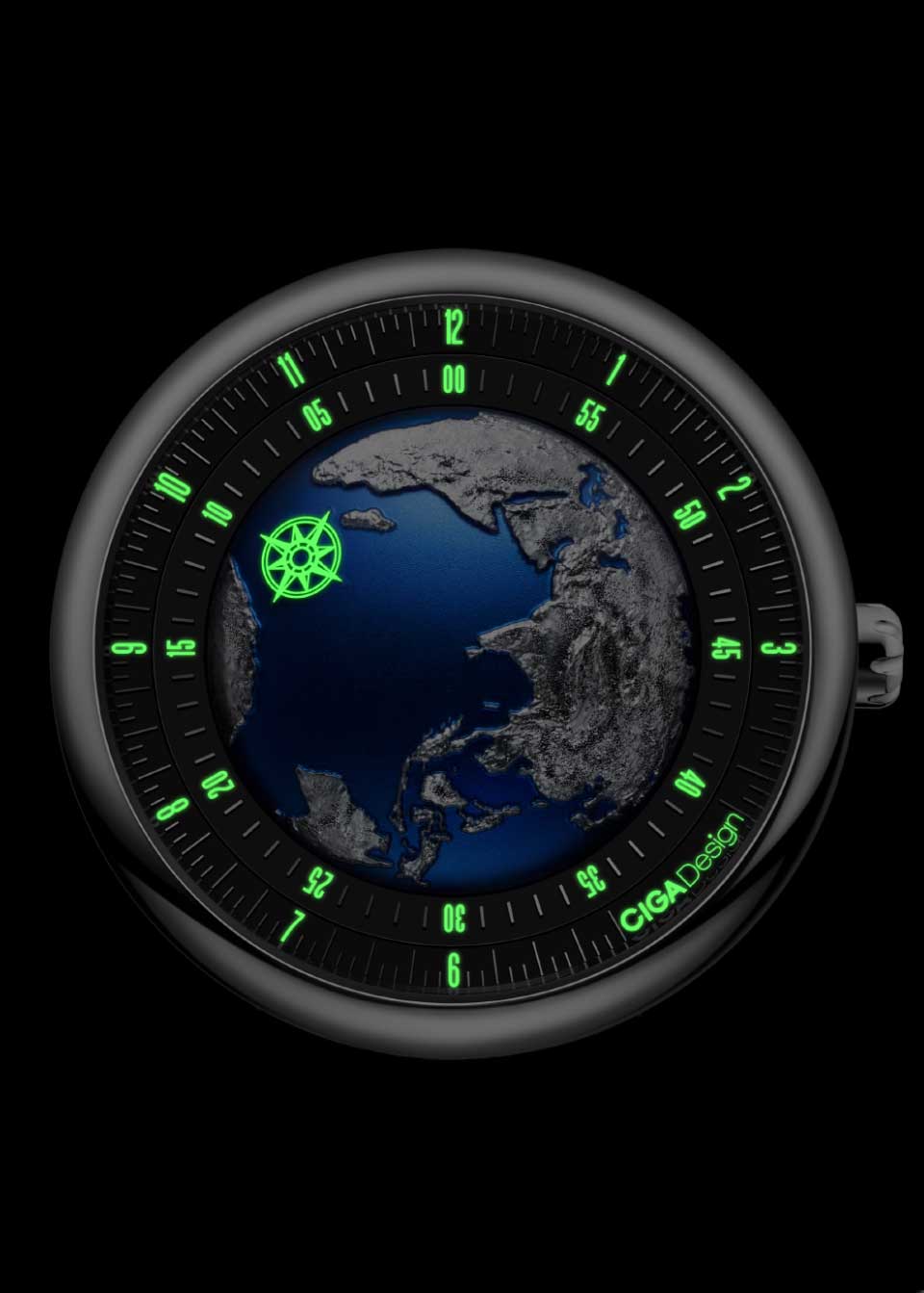 Минутное кольцо не вращается каждый час, а поворачивается на 360 градусов каждые 60 минут, чтобы совпасть с индикатором часов. Таким образом, время считывается только в одном месте, с помощью единственного указателя — компасной розы, указывающей часы и минуты. Часовая и минутная стрелки выравниваются в любое время суток.