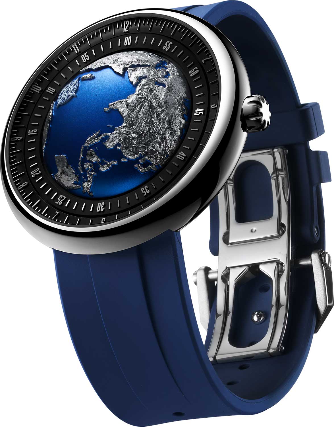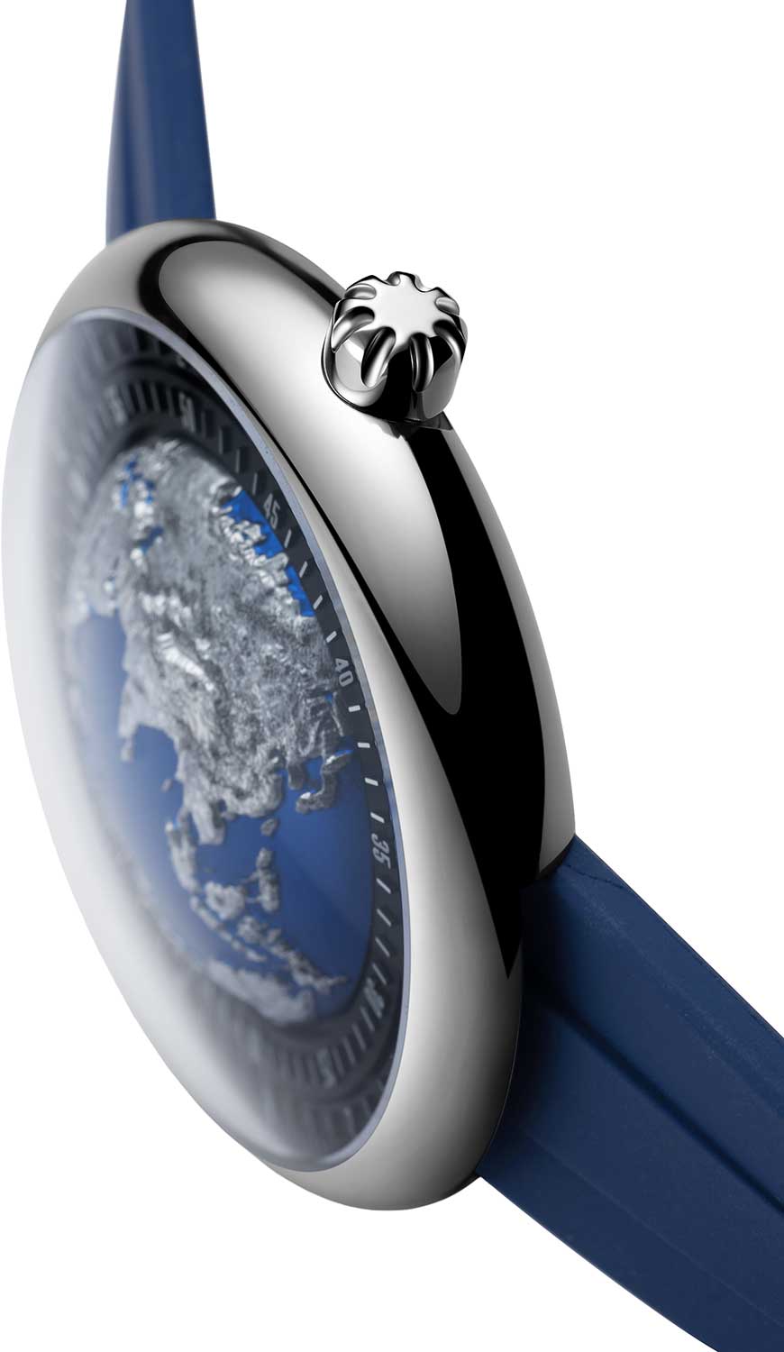 Центральная часть многослойного циферблата представляет собой куполообразную алюминиевую конструкцию с рельефным изображением континентов, окружающих Индийский океан. Вся эта секция вращается с течением времени. Вокруг глобуса расположено вращающееся кольцо для минут и неподвижное кольцо для часов.