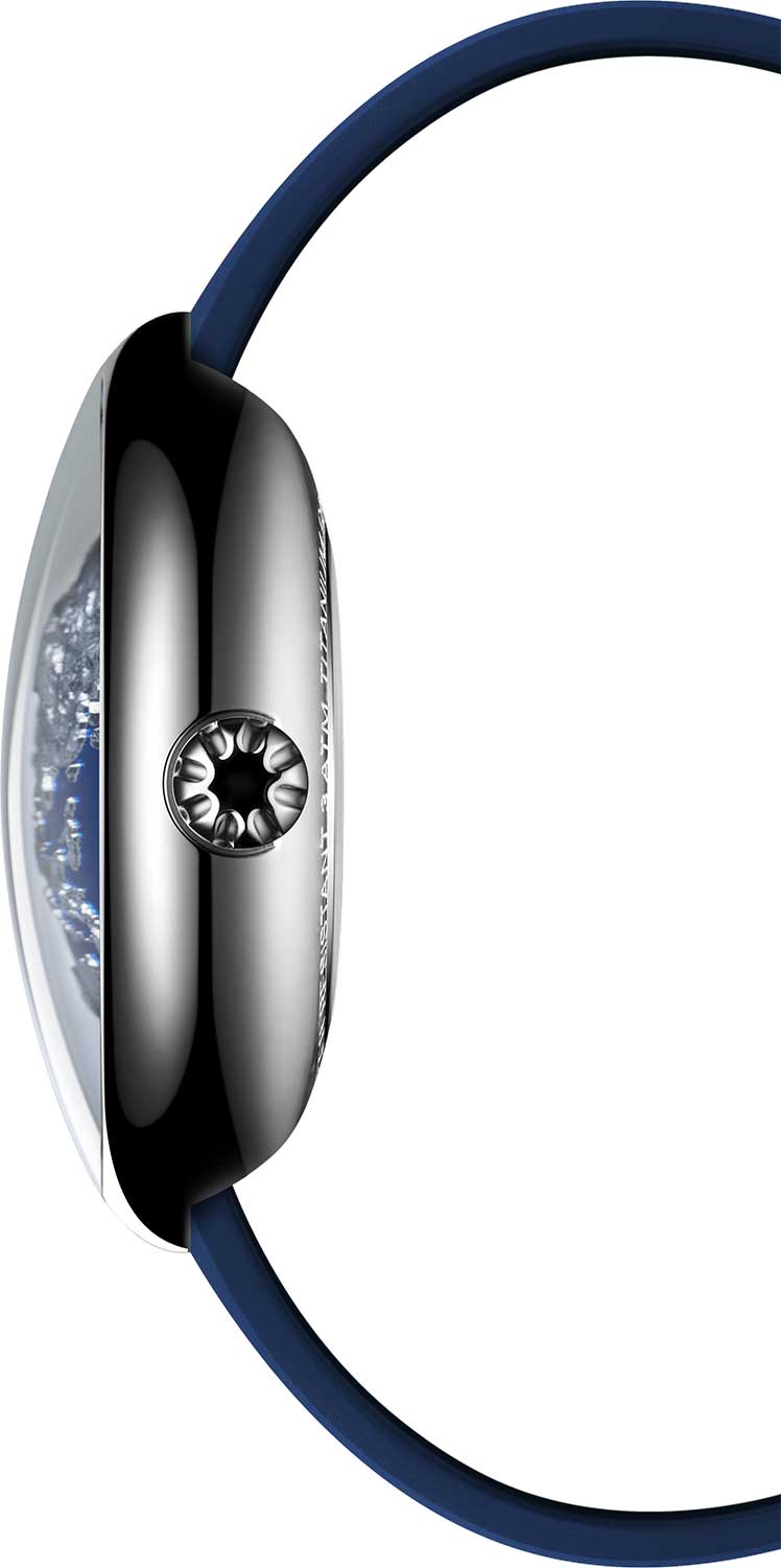 Выпуклое сапфировое стекло служит напоминанием об атмосфере и той защите, которую она обеспечивает. Прозрачная задняя крышка. Ремешок с раскладывающейся застежкой и системой быстрой замены.
