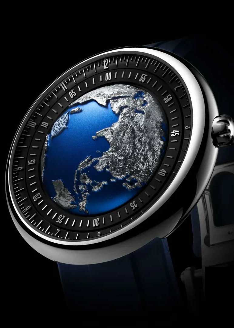 Центральная часть многослойного циферблата представляет собой куполообразную алюминиевую конструкцию с рельефным изображением континентов, окружающих Индийский океан. Вся эта секция вращается с течением времени. Вокруг глобуса расположено вращающееся кольцо для минут и неподвижное кольцо для часов.