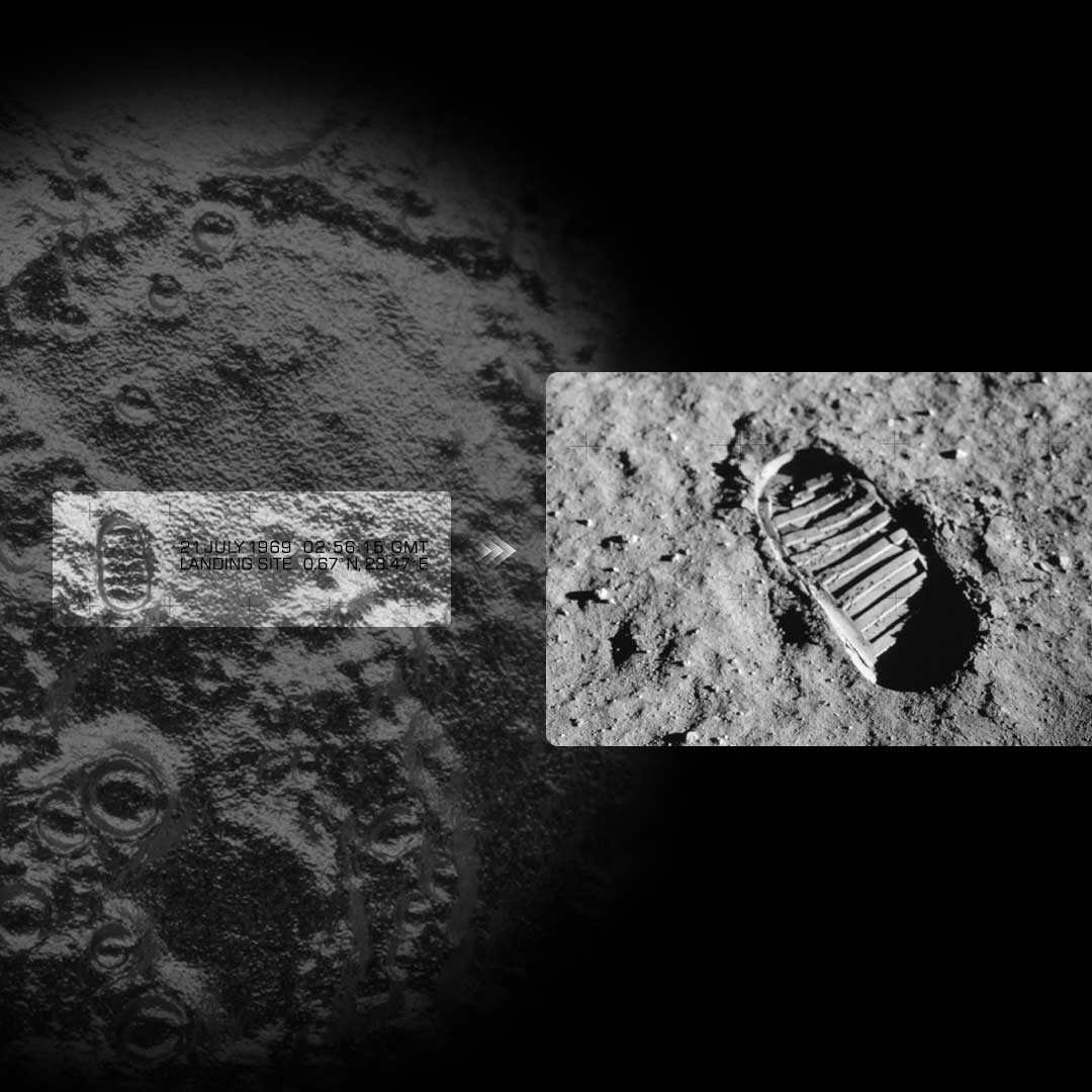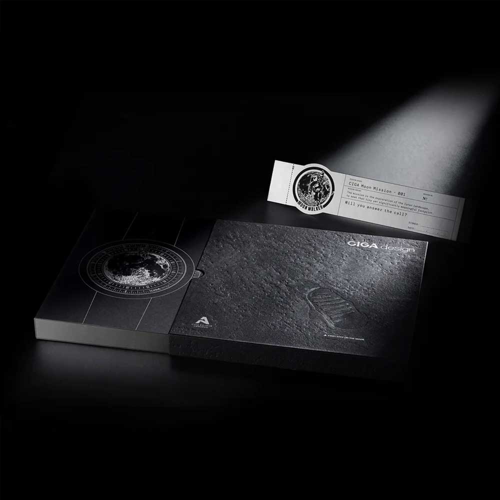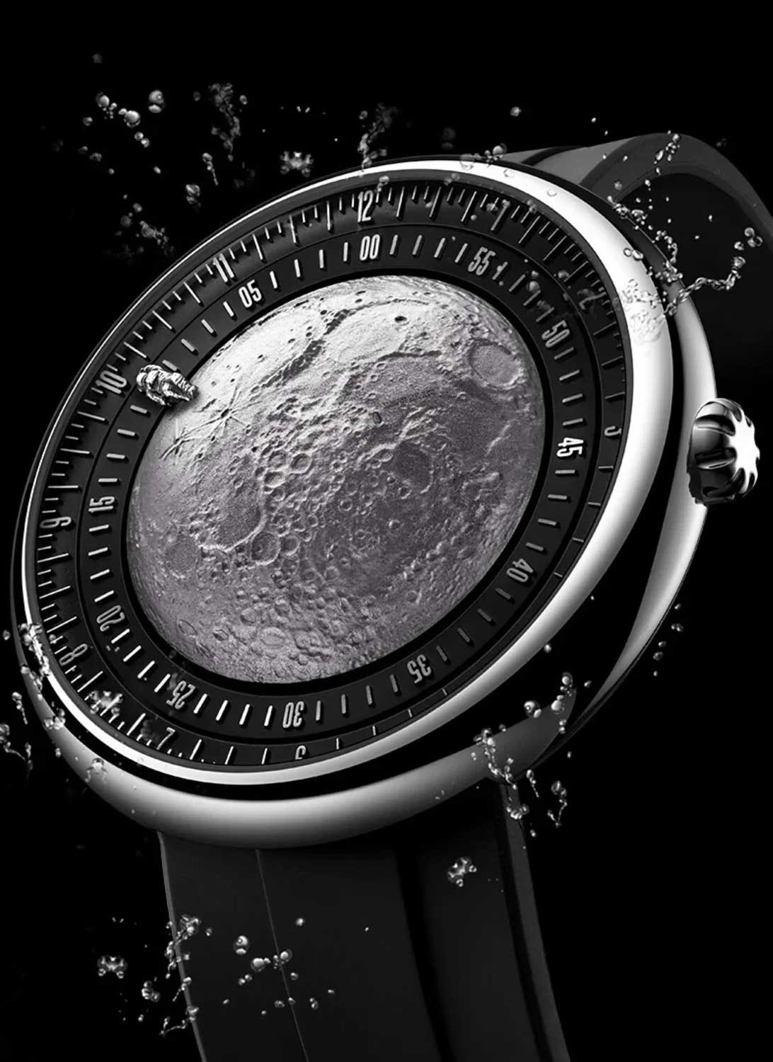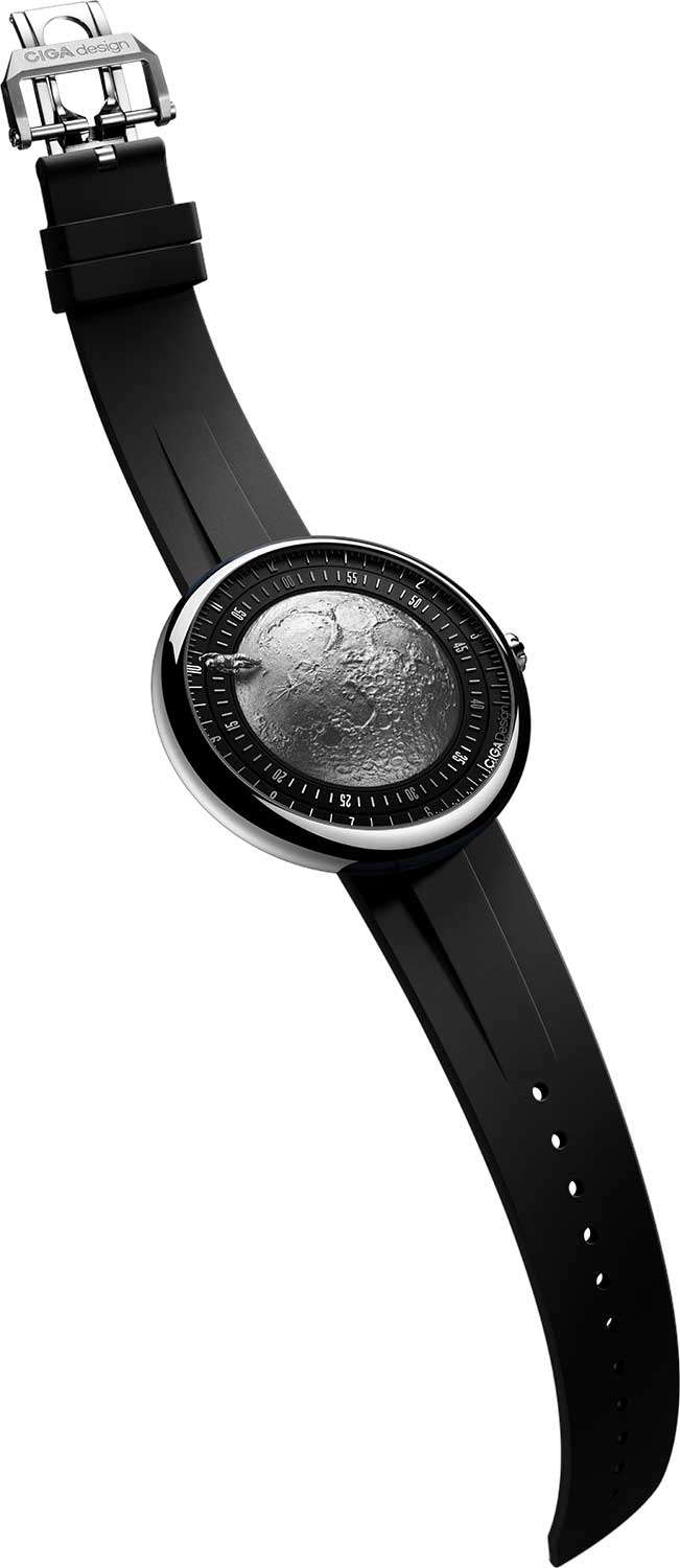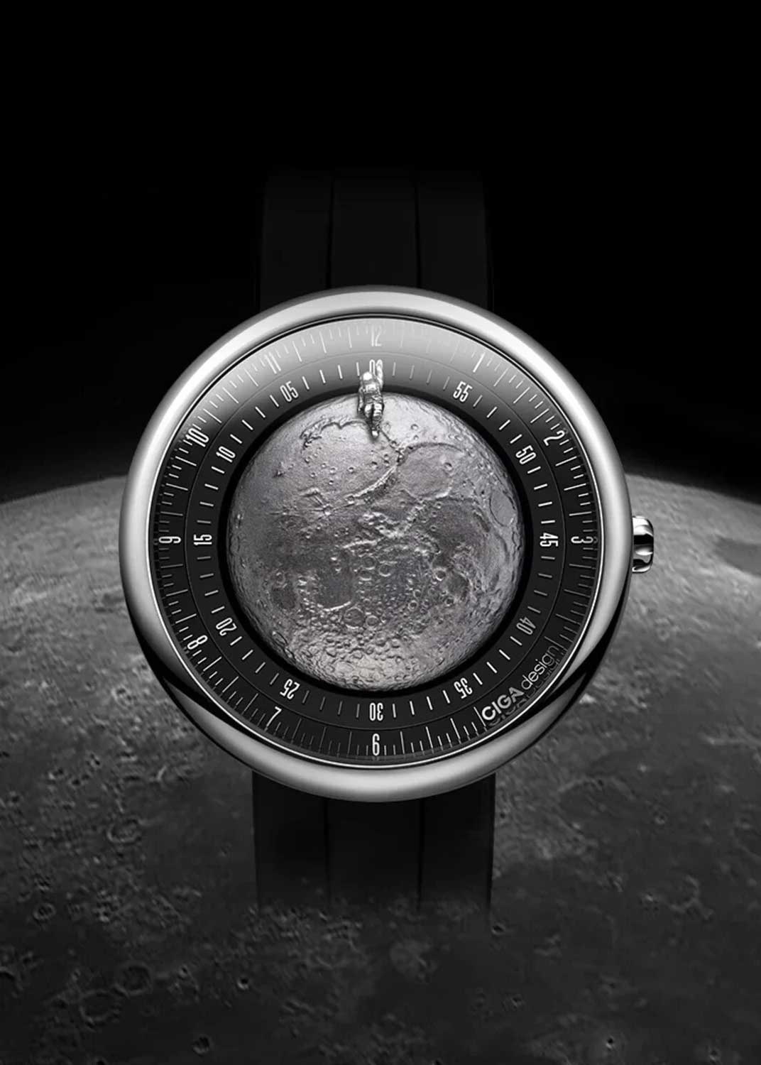 Центральная часть многослойного циферблата представляет собой куполообразную алюминиевую конструкцию с рельефным изображением обратной стороны Луны, которое выполнено с детальной точностью благодаря снимкам NASA. Также циферблат украшен легендарным первым следом Нила Армстронга на Луне и координатами где оставлен след. Вокруг Луны расположено вращающееся кольцо для минут и неподвижное кольцо для часов.