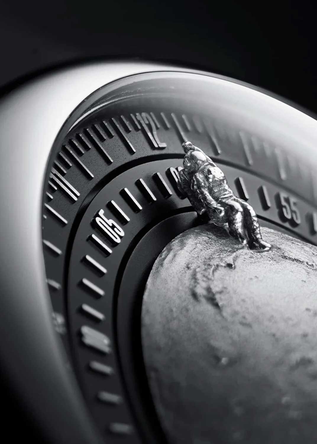 Минутное кольцо не вращается каждый час, а поворачивается на 360 градусов каждые 60 минут, чтобы совпасть с индикатором часов. Таким образом, время считывается только в одном месте, с помощью единственного указателя — миниатюрного астронавта с вытянутой рукой, указывающей часы и минуты. Скафандр астронавта достоверно воссоздан и отполирован вручную. Часовая и минутная стрелки выравниваются в любое время суток.