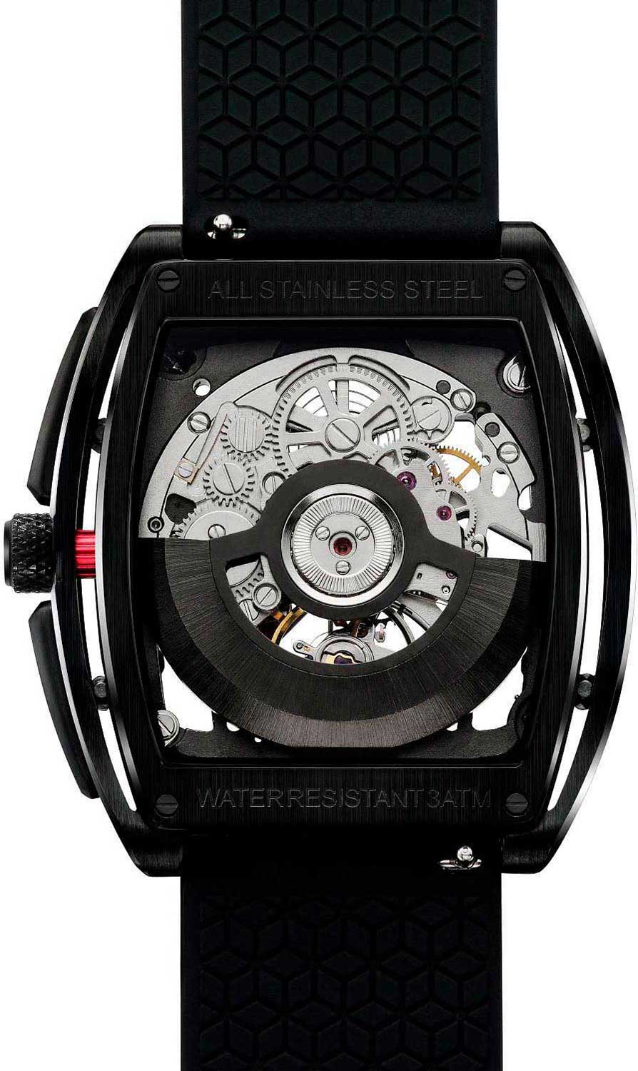Цельная шкала циферблата на внутренней стороне корпуса. Ажурные стрелки с яркими акцентами. Прозрачная задняя крышка крепится на 4-х винтах. Заводная головка с защитой. Силиконовый ремешок с классической застежкой имеет функцию быстрой замены. В комплекте сменный кожаный ремешок. Фирменная подарочная упаковка.