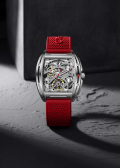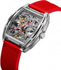 Цельная шкала циферблата на внутренней стороне корпуса. Ажурные стрелки с яркими акцентами. Прозрачная задняя крышка крепится на 4-х винтах. Заводная головка с защитой. Силиконовый ремешок с классической застежкой имеет функцию быстрой замены. В комплекте сменный кожаный ремешок. Фирменная подарочная упаковка.