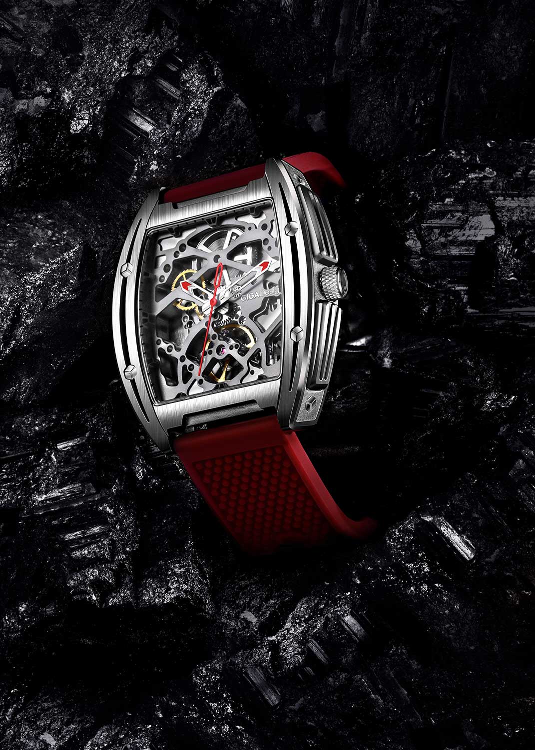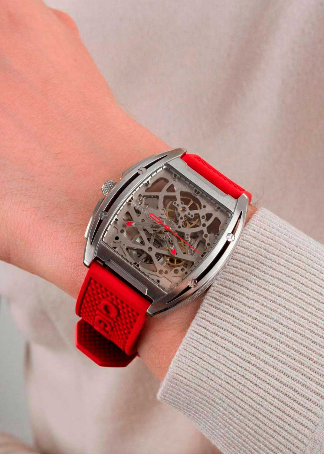 Цельная шкала циферблата на внутренней стороне корпуса. Ажурные стрелки с яркими акцентами. Прозрачная задняя крышка крепится на 4-х винтах. Заводная головка с защитой. Силиконовый ремешок с классической застежкой имеет функцию быстрой замены. В комплекте сменный кожаный ремешок. Фирменная подарочная упаковка.