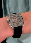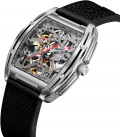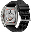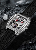 Цельная шкала циферблата на внутренней стороне корпуса. Ажурные стрелки с яркими акцентами. Прозрачная задняя крышка крепится на 4-х винтах. Заводная головка с защитой. Силиконовый ремешок с классической застежкой имеет функцию быстрой замены. В комплекте сменный кожаный ремешок. Фирменная подарочная упаковка.