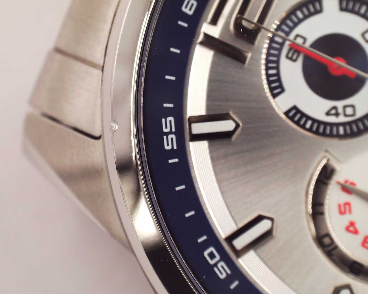 Часы-хронограф с секундомером. Секундомер с точностью 1с и временем измерения 12ч. Секундная стрелка вынесена на отдельный циферблат. Круглый стальной корпус с минеральным стеклом. Циферблат с метками в виде штрихов выполнен по технологии Sunray (солнечные лучи). Окошко даты находится в положении 3 часа. Заводная головка с защитой. Надежный стальной браслет с раскладывающейся застежкой.