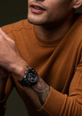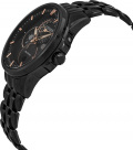 Циферблат с метками в виде штрихов защищен прочным сапфировым стеклом. Число, день недели, месяц и фазы Луны вынесены на отдельные циферблаты. Рифленая заводная головка с защитой. Браслет с раскладывающейся застежкой.